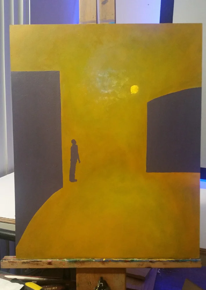 But my primary issue is a lack of inspiration in regards to content within my paintings. I spoke about this some a few weeks ago. I recently wasted a week or so staring at a piece I'm working on, trying to figure out where I want to go with it. I've had a few ideas, tried them, erased them. And so it still currently sits in the same half-finished state it did two weeks ago. (Gold/Yellow and Blue Gray painting with figure)