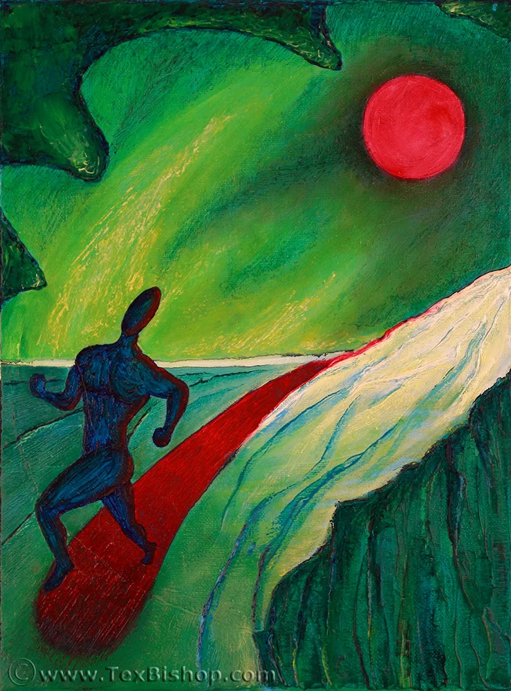 Often, when I'm planning a composition, the idea that begins it isn't a scene or occurance that inspired it. It's more of a concept. In this one, I was exploring a few different things at the same time. 1) There was some material exploration: I was trying out a putty medium. 2) I wanted to work with a red/green color relationship. And 3) I had this image of a blood red moon looking downward menacingly, stuck in my head.