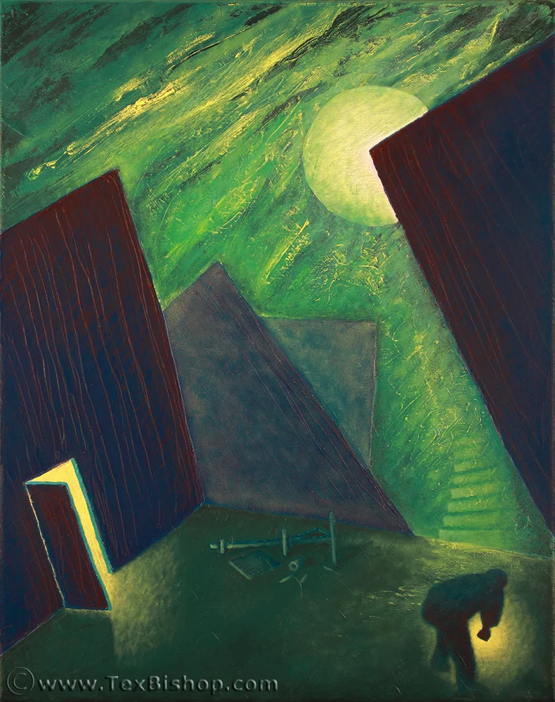 Surreal urban landscape with figure, man searches among buildings of impossible angle, primary colors green and blue